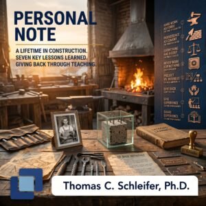 The rest of my career has been spent teaching, consulting, and writing about everything that (7) I learned from my experiences during a lifetime in construction. Looking back, I am grateful to have had such a varied career. Much of what I learned about the business of construction I learned in the field doing the work. None of my contemporaries had the wide variety of hands-on experience that was afforded to me to combine with four years of Ph.D. level industry specific research. All my teaching comes from experience and study, and I want to share it with all of you as another way of “giving back”. There will never be any charge for this information.